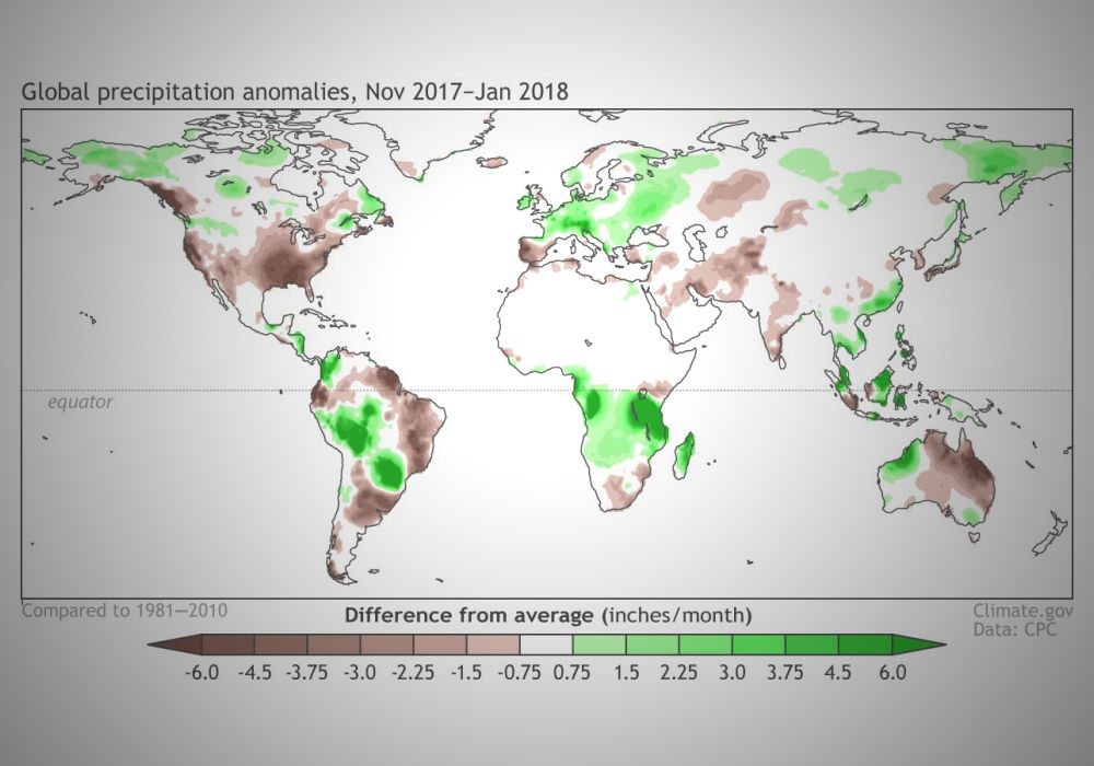 Las precipitaciones en gran parte del país estuvieron dentro de lo normal en buena parte del norte, centro y sur del territorio, exceptuando los estados del noroeste donde fue más seco de lo normal y una pequeña zona limítrofe entre Veracruz, Tabasco, Oaxaca y Chiapas, así como el norte de Quintana Roo presentaron condición más húmeda, esto probablemente por lo que se mencionó anteriormente del ingreso de constantes masas frías, transportando lluvias por los eventos “Norte”. No está de más aclarar que en los inviernos, independientemente de El Niño o La Niña, las lluvias son escasas en México, ya que la estación de lluvias es entre verano y otoño, así que tener condiciones más secas de lo normal puede implicar definitiva ausencia de lluvia.