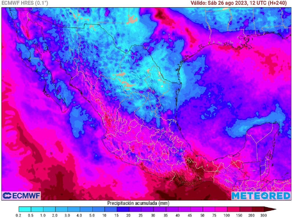 Como pocas veces, estos modelos coinciden casi por completo en el comportamiento de las precipitaciones al concentrarse la mayor cantidad (superior a 250 mm) en la península de Baja California por Hilary, estados de la Sierra Madre Occidental, centro, sur, oriente y sureste, contrastando con el norte y noreste donde podrían ser inferiores a 70 mm.