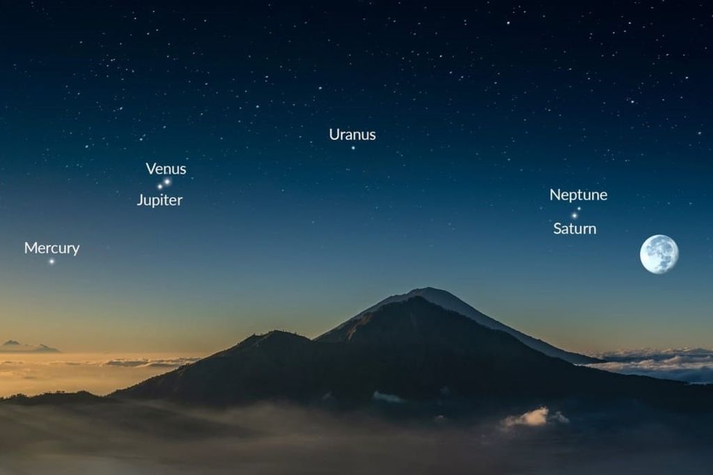 Mercurio, Venus, Júpiter serán visibles en el cielo oriental, además, Saturno, Urano y Neptuno también estarán presentes, aunque sólo podrán verse con binoculares o telescopios y aunque la Luna estará casi llena y acompañará la escena desde el lado opuesto del cielo por lo que no interferirá con el espectáculo.
