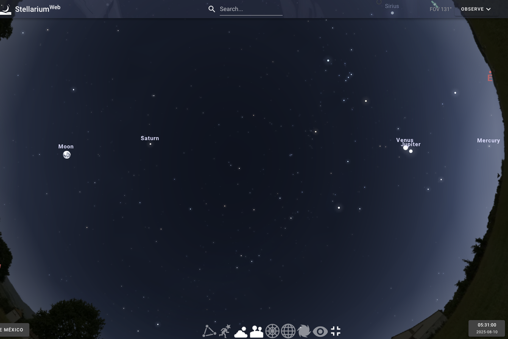 La alineación será visible en todo el país, siempre que el clima lo permita. En Ciudad de México, por ejemplo, bastará con mirar hacia el este-sureste en la madrugada del 10 de agosto, entre las 5:20 y 5:50 a. m., el cielo aún estará oscuro y varios planetas estarán ya por encima del horizonte.
