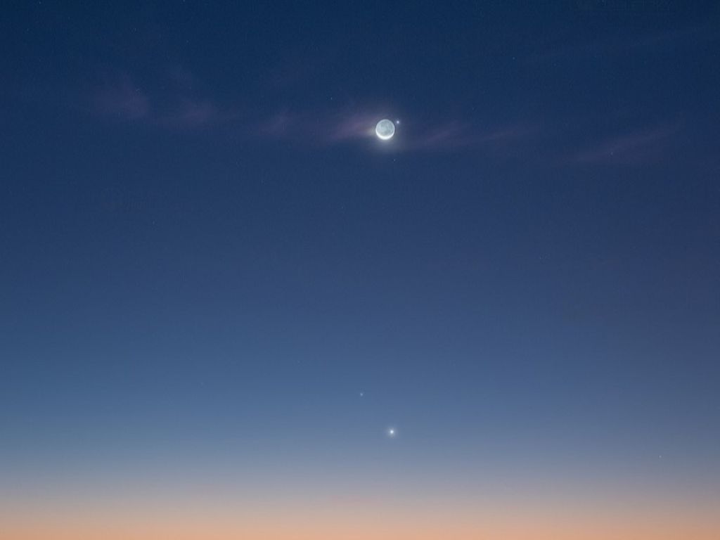 Por su parte la Luna en su fase gibosa creciente, aquella tímida sonrisa después del atardecer, se encontrará con Mercurio que se va alejando cada vez más del Sol, desde nuestra perspectiva, para alcanzar su máxima elongación o punto más alto en el cielo
