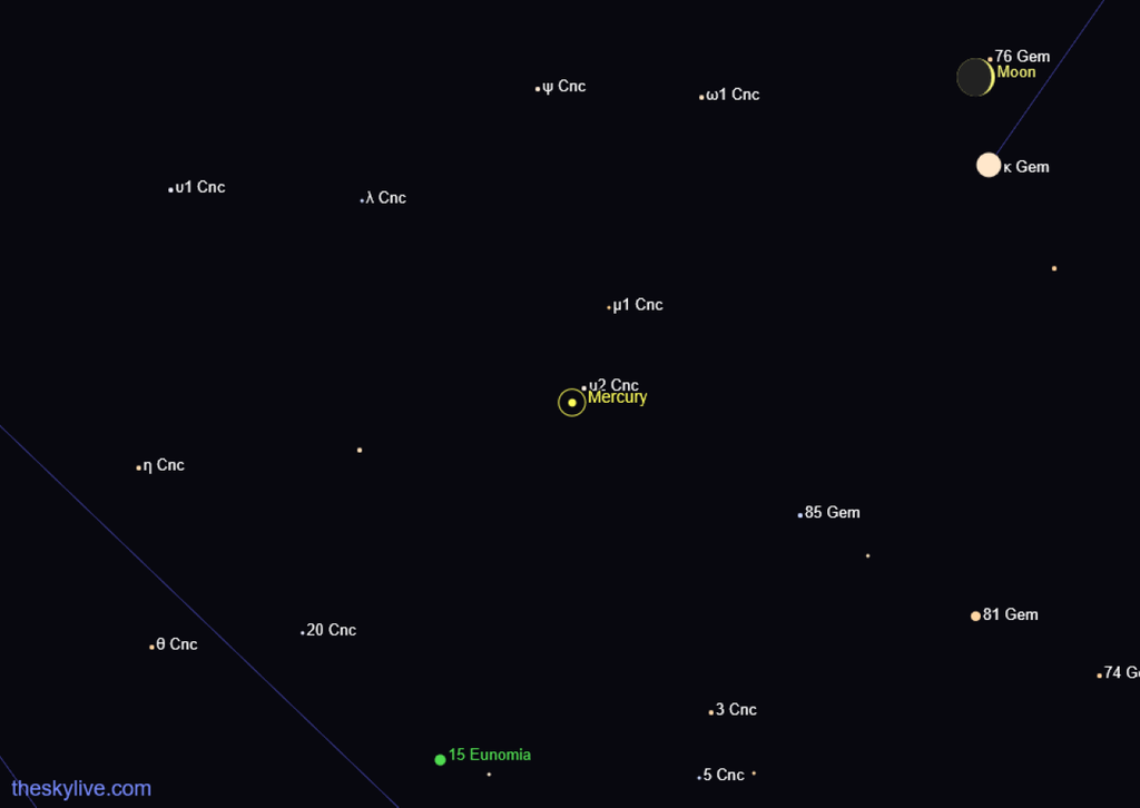 Por su parte Mercurio en su viaje alrededor del Sol, alcanza un punto tal que, al verlo desde la Tierra, parece estar mucho más arriba de lo común, lo que se traduce en que al ocultarse el Sol, lo podemos apreciar por arriba del horizonte por un poco más de tiempo.