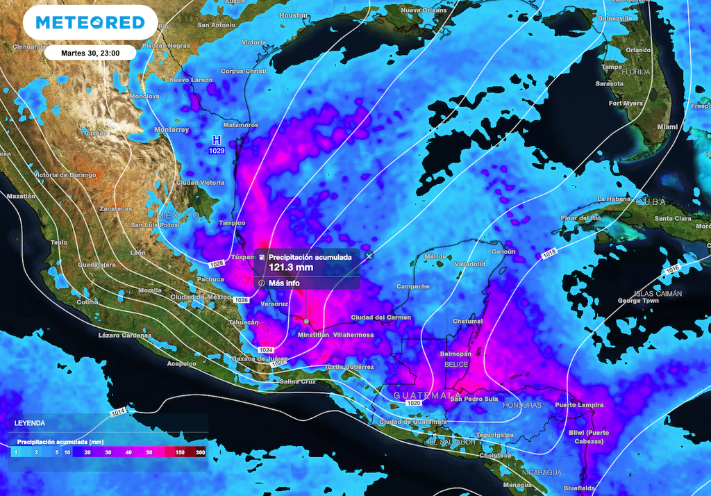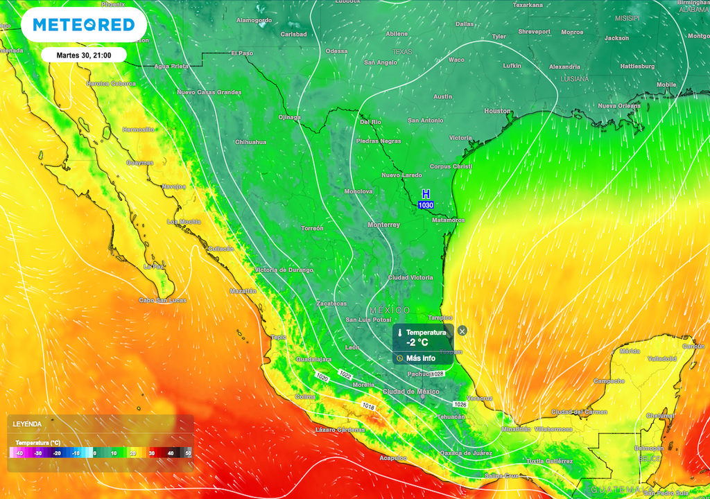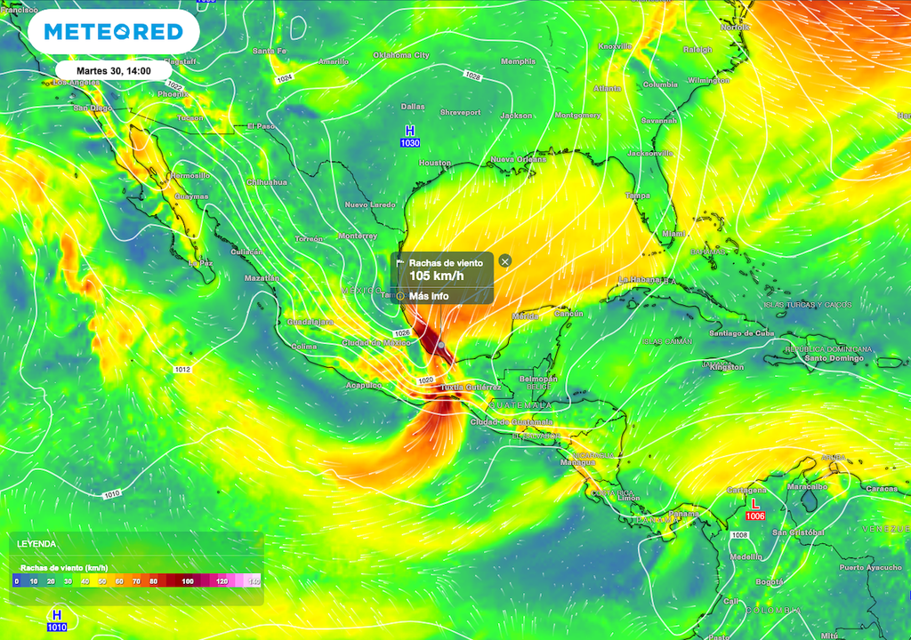 Conforme se interne y extienda la masa de aire ártico favorece un evento de “Norte” con rachas de viento de 80 a 120 km/h en costas de Veracruz, Tabasco hasta el Istmo y Golfo de Tehuantepec que contempla a los estados de Oaxaca y Chiapas. Los fuertes vientos dan paso a oleaje de 4 a 6 metros de altura en costas de Tabasco, Veracruz y en costas del Golfo de Tehuantepec.