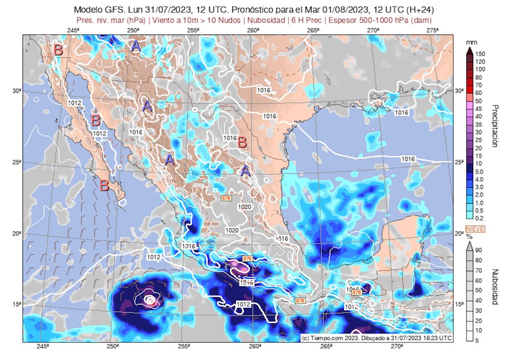 Fue la interacción de una onda tropical asociada a una baja presión y la Zona de Convergencia Intertropical quienes dieron paso a la DT 5-E que en combinación con los efectos asociados al Monzón mexicano, permiten la presencia de nublados convectivos que llegan incluso al centro del país, favoreciendo también la presencia de chubascos en esa región.