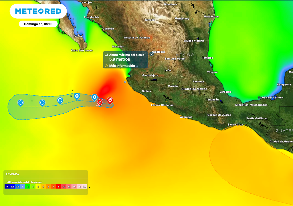 Derivado de los vientos sostenidos se esperan olas de 4 a 6 metros en costas de Jalisco, Nayarit y Colima y olas de 3 a 4 metros de altura en costas de Sinaloa, Guerrero y Michoacán.