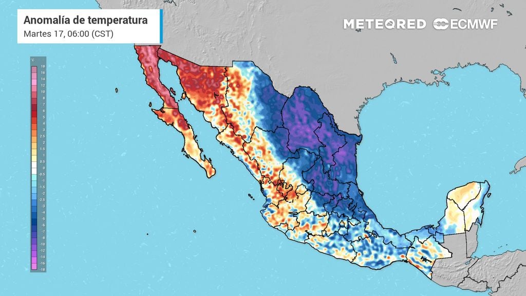 Mañana se mantendrán estos efectos, aunque cediendo el viento, acentuándose y cubriendo más zonas el descenso térmico, mientras las lluvias se presentan con intensidad. En contraste y en respuesta a esta circulación, todos los estados del Pacífico experimentarían un notable aumento térmico con valores extremos superando 40 °C.