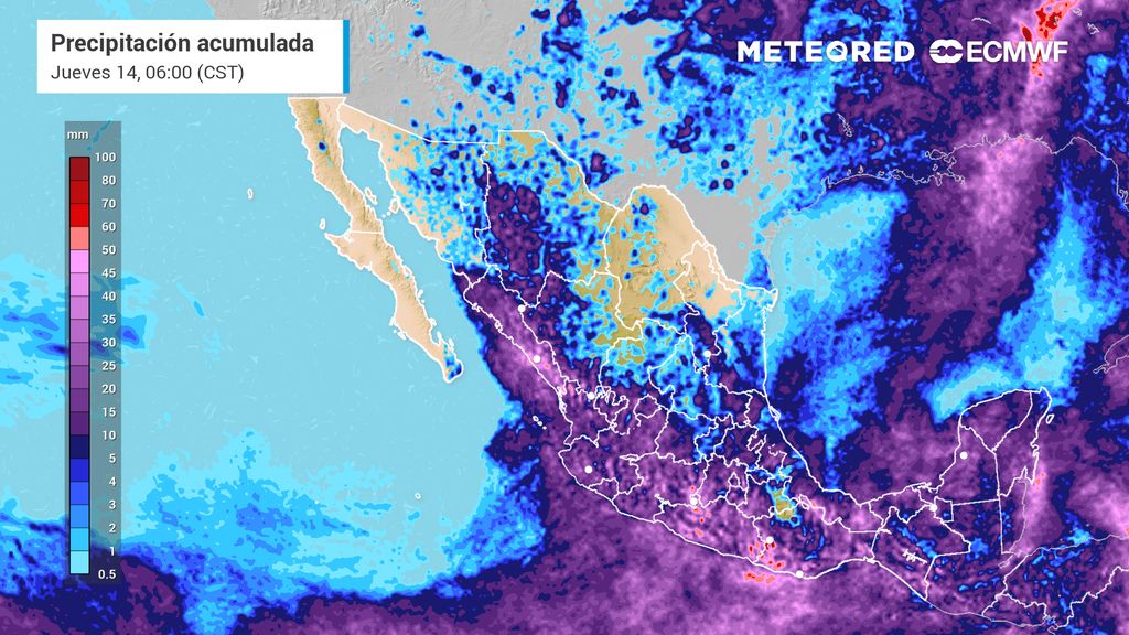 Se esperan lluvias muy fuertes (50 a 75 mm) en Sonora, Chihuahua, Durango, Sinaloa, Nayarit, Jalisco, Michoacán, Guanajuato, Estado de México, Guerrero, Oaxaca y Chiapas, lluvias fuertes (25 a 50 mm) en Colima, Zacatecas, Ciudad de México, Morelos, Puebla, Veracruz, Tabasco, Campeche y Yucatán, y lluvias moderadas (5 a 25 mm) en Baja California Sur, Nuevo León, Tamaulipas, San Luis Potosí, Aguascalientes, Querétaro, Hidalgo, Tlaxcala y Quintana Roo.
