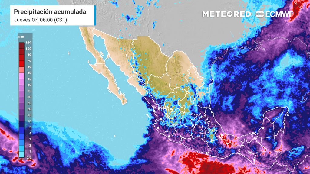 Se esperan lluvias intensas (75 a 100 mm) en Oaxaca, Chiapas, Tabasco y Veracruz, lluvias muy fuertes (50 a 75 mm) en Puebla y Campeche, lluvias fuertes (25 a 50 mm) en Jalisco, Colima, Michoacán, Guerrero, Yucatán y Quintana Roo.