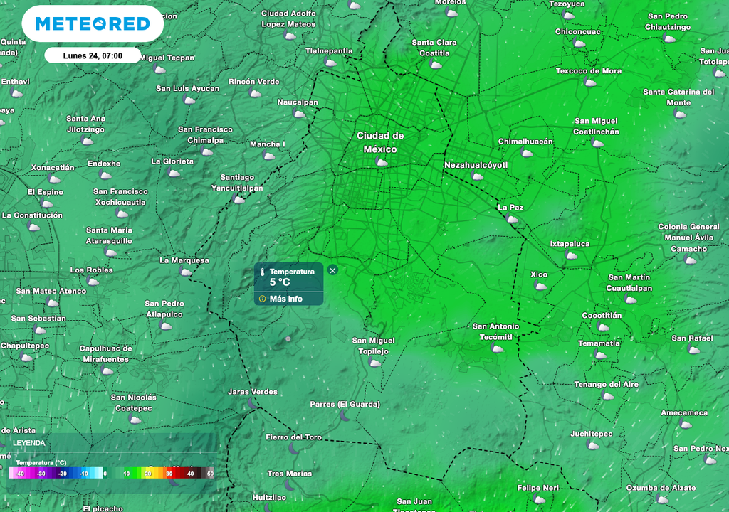 Por la mañana, se prevé cielo con nubes dispersas, ambiente fresco en la región y frío con temperaturas de 0 a 5 °C en el Valle de México. Durante la tarde, ambiente templado a cálido, cielo medio nublado y probabilidad de lluvias aisladas de 0.1 a 5 mm en 24 horas en el Estado de México.