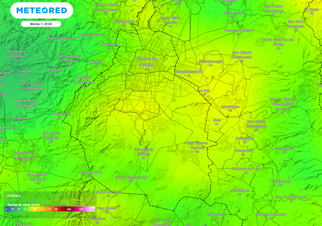 Mientras que, el viento sostenido se prevé sea variable de a hasta 30 km/h con rachas de hasta 60 km/h, esto derivado de la influencia de una vaguada en superficie extendida sobre el centro del país. Las rachas más fuertes podrían registrase en el transcurso de la tarde y por la noche, dando paso a la posible formación de torbellinos y/o tolvaneras.
