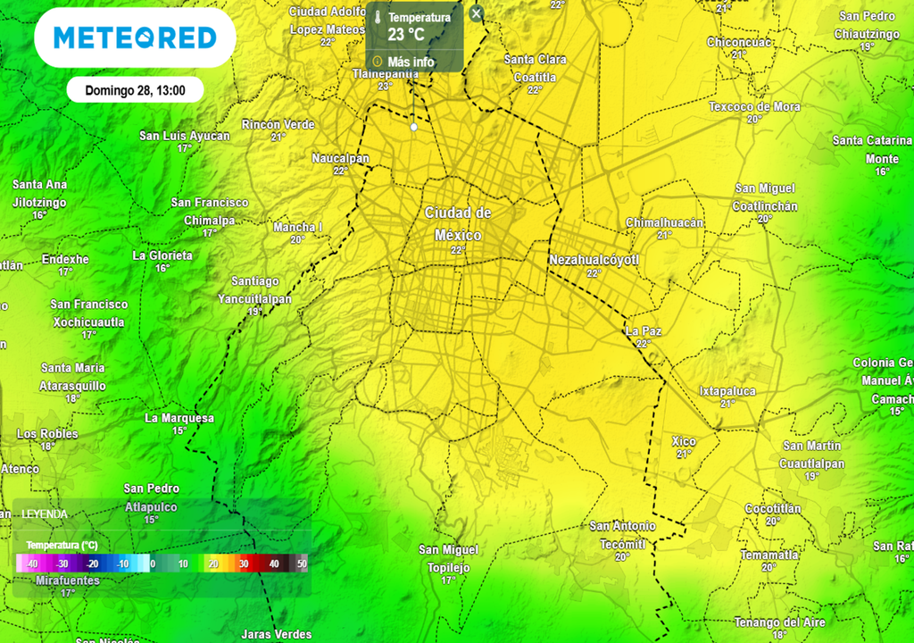 En la tarde del domingo la temperatura máxima oscilará entre 22 y 24 °C en gran parte de la ciudad, excepto en las alcaldías Cuajimalpa, Álvaro Obregón, La Magdalena Contreras, Tlalpan, Xochimilco, Tláhuac y Milpa Alta, donde se mantendrá inferior a 20 °C.