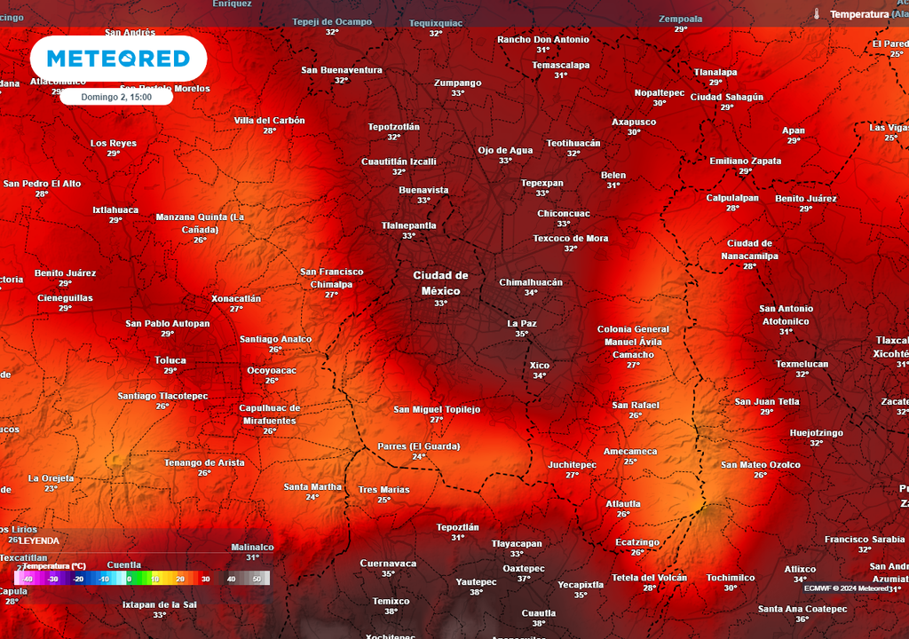 Conforme pase la mañana, se mantendrá despejado y aumentando rápido los valores térmicos previéndose máximas de 32-35 °C en CDMX y Edomex, rondando los 28 a 32 °C en la periferia, ligeramente menos caluroso.