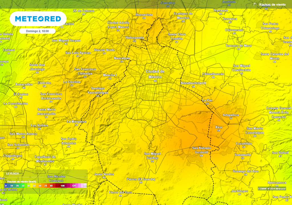 Entre las 6-8 pm el viento podría alcanzar la mayor intensidad con 40 a 55 km/h en el poniente, norte y sur, rondando los 45 a 65 km/h al sureste entre Tláhuac, Milpa Alta y parte de Xochimilco; el resto de la ciudad se estima de 35 a 45 km/h.