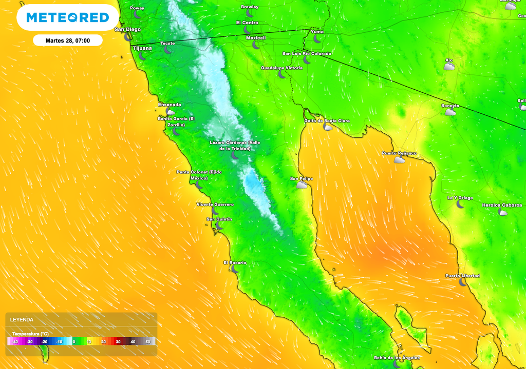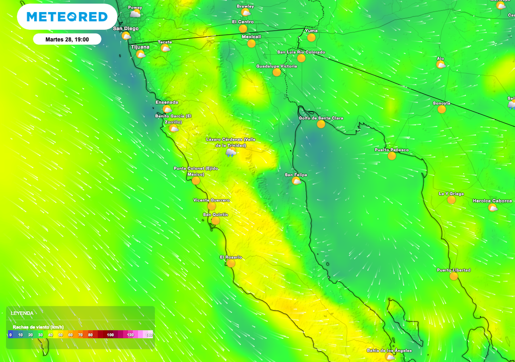 El viento de componente noroeste de 40 km/h, con rachas de hasta 60 km/h, las ráfagas más intensas se preven principalmente en la parte suroeste del estado de Baja California. En cuanto al viento más intenso, se preve durante la tarde-noche, dando paso a oleaje de 2 a 4 metros de altura en la costa oeste.
