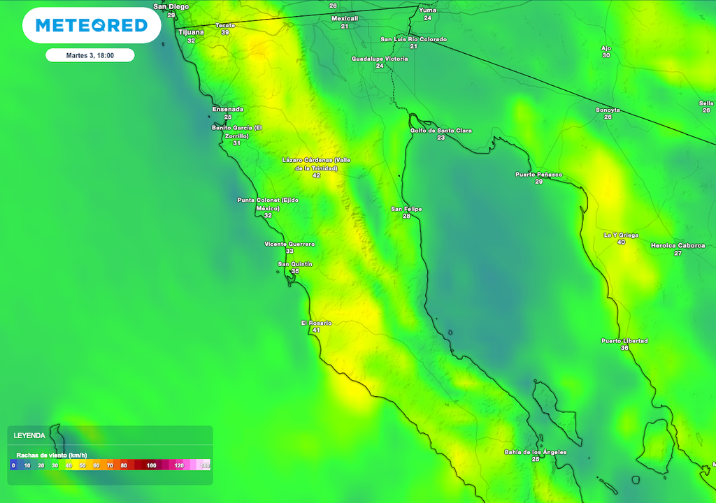 Por otro lado, la presencia de una vaguada en superficie (canal de baja presión) semipermanente al este del estado, favorece vientos moderados a fuertes en gran parte de la Península de Baja California. Se espera que, el viento sea del oeste-noroeste con valores que oscilen entre los 15 a 25 km/h con rachas de hasta 50 km/h.