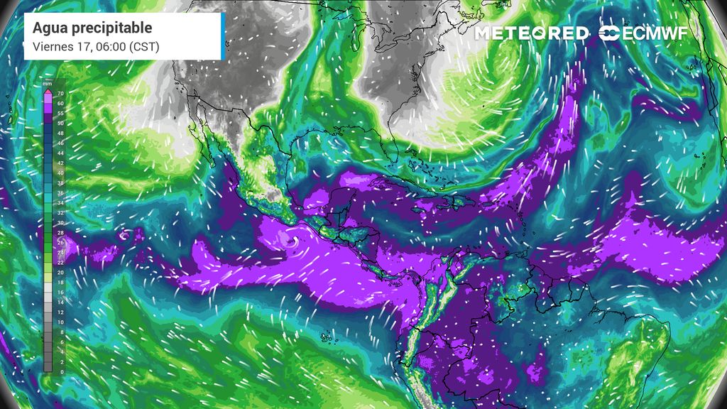 El viernes se podría dar la mayor cantidad de lluvia entre costas/montañas de Chiapas y Oaxaca con 100-250 mm y de 50-100 mm en Tabasco y sur de Veracruz; el sábado entre Oaxaca y Guerrero con más de 200 mm, que será cuando se extenderían de 20-75 mm en el oriente y centro. Mientras el domingo continuarían en estas regiones, extendiendose desde Oaxaca hasta Jalisco.