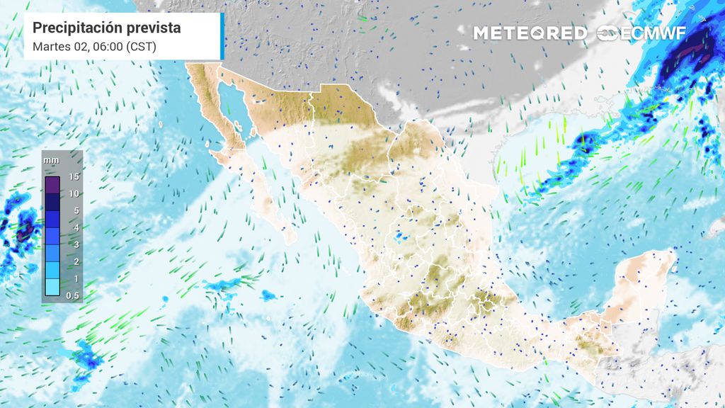 Eventos aislados menores a 15 mm aún estarían en occidente, centro y sur, resaltando montañas. El miércoles comenzarán a extenderse lluvias, aunque de cantidades bajas, pronosticándose para Baja California, Baja California Sur, Sonora, Sinaloa, Chihuahua, Durango, Coahuila, Estado de México, Ciudad de México, Morelos, Guerrero, Oaxaca y Quintana Roo con 5-20 mm.