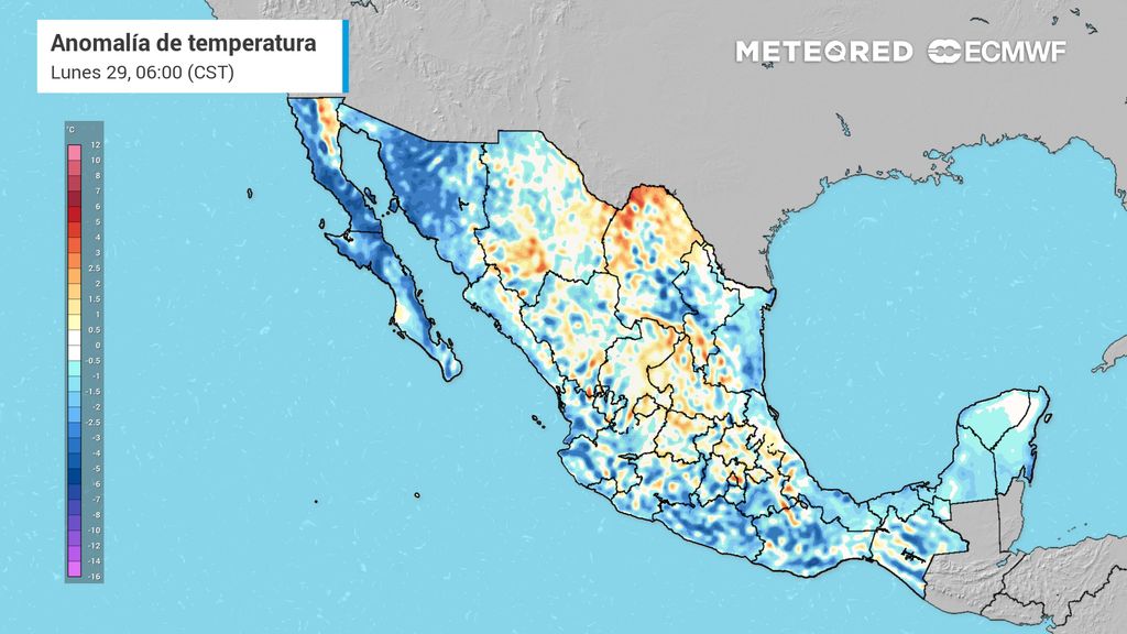 Las heladas podrían presentarse en estas regiones hacia los amaneceres, además de nieve en los volcanes cuando las tormentas se generen. Sobre las entidades costeras del Golfo de México y Pacífico sur rondarían los 29-34 °C, tambien regulándose por lluvias, para sentirse menos caluroso o incluso, un poco más fresco en horas nocturnas.