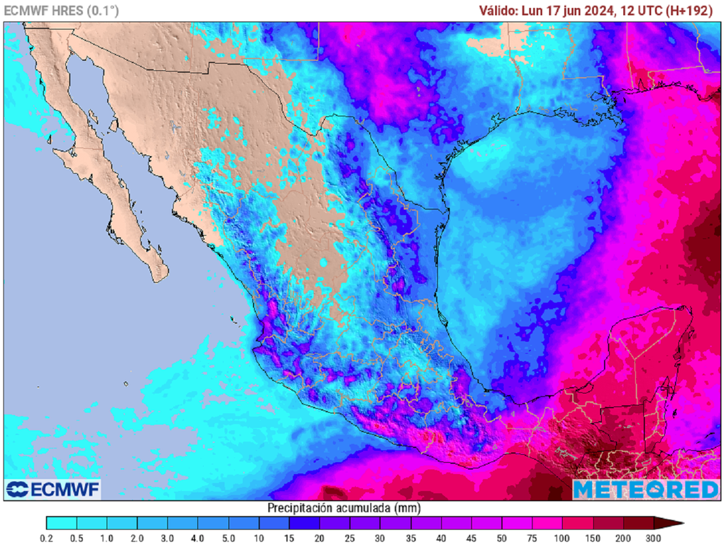De ligera menor cantidad, pero básicamente todas estas regiones/estados mantendrían lluvias de 20-50 mm el sábado y domingo, superando aún de 100-250 mm en el sureste; se podrían añadir el sur de Tamaulipas, la Sierra Madre Occidental y parte del Valle de México con 5-20 mm.