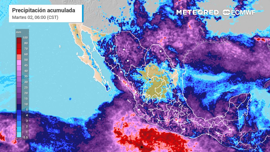 Tentativamente podría ser justo en península de Yucatán, frontera de Chihuahua con EEUU, costas del Pacífico de las Baja Californias, la región Mixteca de Puebla y Oaxaca y en La Laguna; sí lloverá, pero sería poco; en los demás estados se darían lluvias normales. Los acumulados rondarían los 5-20 mm con algunos puntualmente mayores.