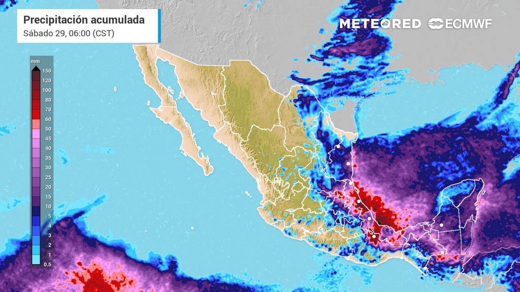 Los mayores acumulados rondarían Veracruz, sur de Tamaulipas y Huasteca con locales de 70-150 mm. El sábado serían lluvias aisladas en costas de Tamaulipas, Quintana Roo, Guerrero, Oaxaca de 5-20 mm y algunas mayores, mientras que el domingo vuelven a incrementarse en el noreste, oriente, sureste y parte del centro-sur.