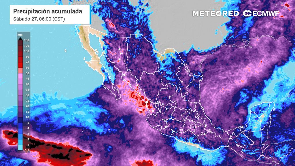 En las demás entidades, las lluvias serían más aisladas y de menor cantidad. Durante el sábado, se prevé la misma extensión de lluvias, pero de menor cantidad con 20-40 mm y puntuales de 50-100 mm abarcando más en Coahuila y Baja California Sur; tentativamente, la región del Bajío podría recibir intensas lluvias.