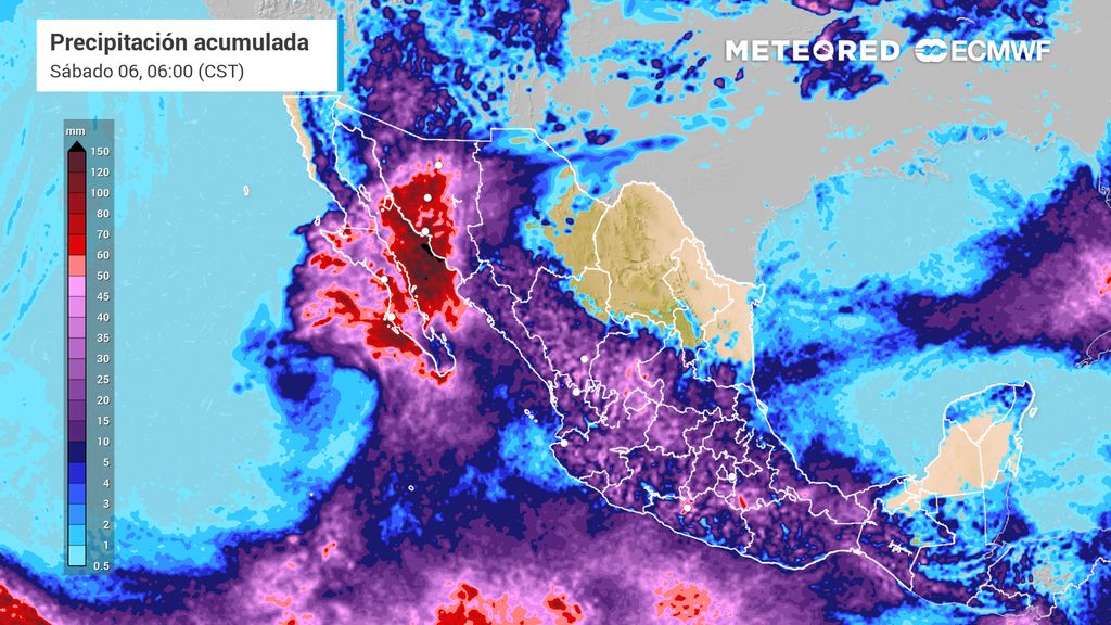 El sábado aumentarían en estados del norte, resaltando Sonora, Chihuahua, Durango, Zacatecas, Coahuila, Nuevo León, Tamaulipas con 10-30 mm de forma dispersa y locales de 50-75 mm incluso mayores a 100 mm en Durango. De forma dispersa seguirían en las demás entidades del occidente, centro-Bajío, oriente, sur y sureste de 5-20 mm y locales de 30-75 mm.