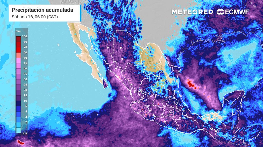 Para la tarde-noche del viernes se pronostican tormentas moderadas a muy fuertes Sonora, Chihuahua, Sinaloa, Durango, Nayarit, Jalisco, Michoacán, Colima, Guanajuato, Querétaro, Hidalgo, Estado de México, Morelos, Ciudad de México, Guerrero, Puebla, Tlaxcala, Oaxaca, Chiapas y Yucatán con 20-50 mm y locales de 70-100 mm en montañas.