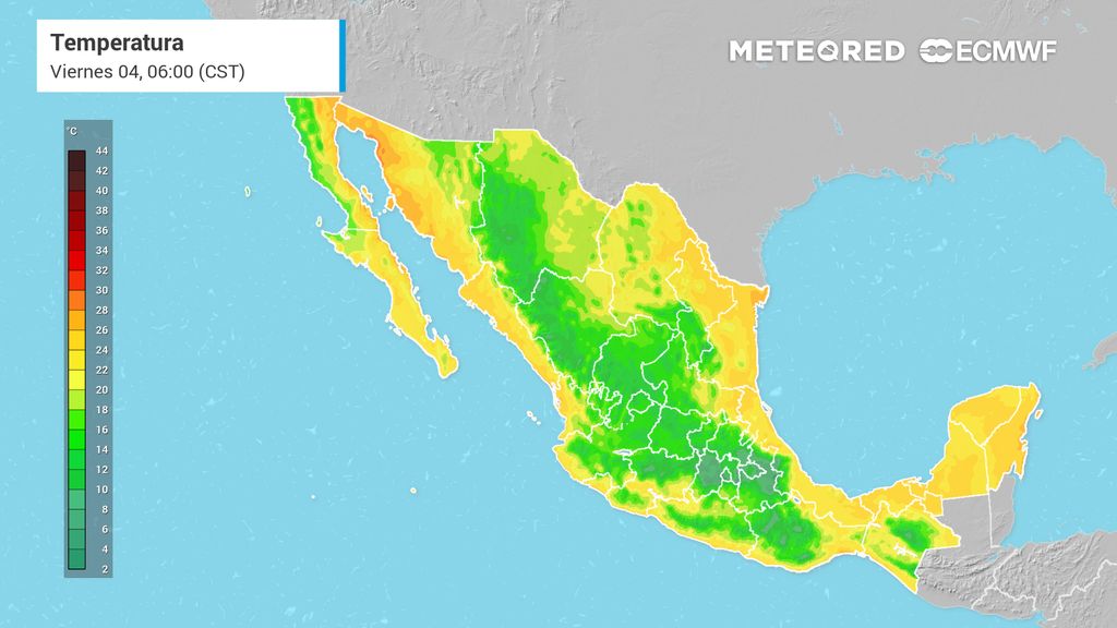 Por su parte, el Altiplano también incrementará con máximas de 22 a 28 °C, incluso mayores en el Bajío y alrededores, pero contrastará con noches más frescas de 5 a 12°C, siendo frías entre valles altos, campo abierto y montañas de Michoacán, Estado de México, Ciudad de México, Morelos, Puebla, Tlaxcala, Hidalgo y Veracruz se esperan heladas con mínimas entre -3 y 5 °C.