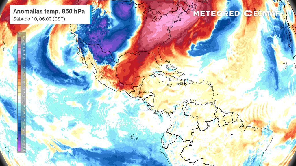 En contraste, el noroeste y norte se irían enfriando con 5-15 °C, siendo lo más bajo en la frontera con Nuevo México y Arizona. El amanecer del sábado sería muy frío en Chihuahua, norte de Sonora, Durango y Coahuila con -10 a 0 °C o menores en montañas, mientras se enfría este día en el noreste, oriente y Sierra Madre Oriental con 10-20 °C en promedio.