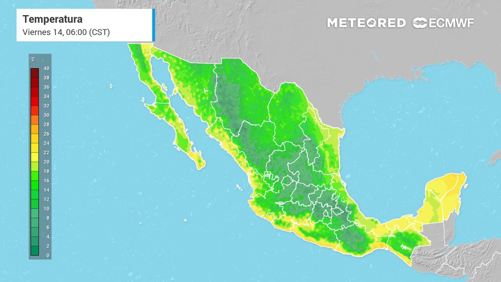 Este viernes aún dominará el calor en el noroeste, noreste, sureste y Pacífico con máximas de 31-39 °C, especialmente Sonora, Sinaloa, Baja California Sur, Nayarit, Jalisco, Colima, Michoacán y Guerrero. Sobre el norte, Altiplano y Golfo de México, oscilarían desde 20 °C en partes altas, hasta los 30 ° C en zonas bajas.