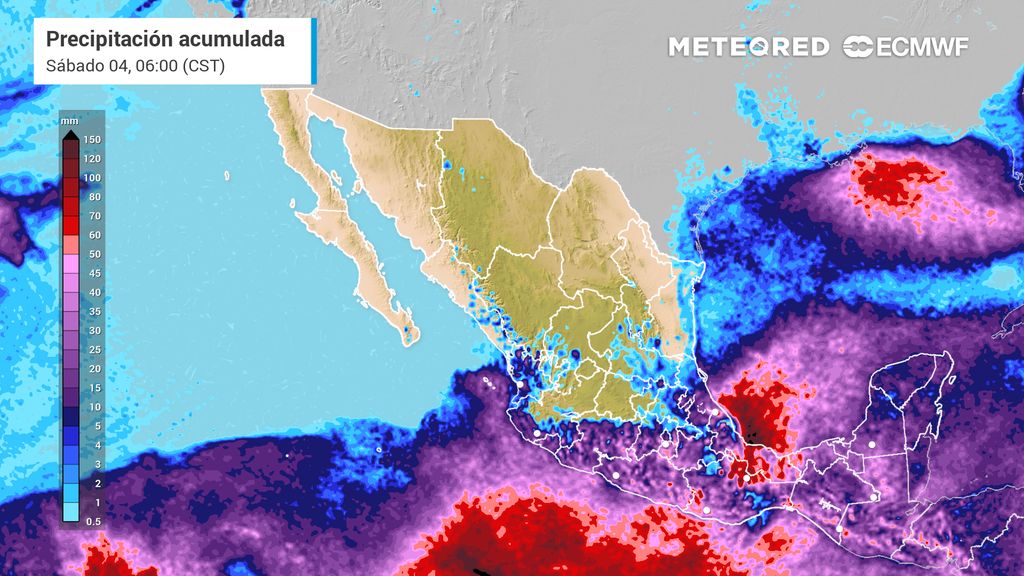 La mitad norte del país seguiría mayormente seca, sin descartar eventos muy aislados en Sinaloa, Nuevo León y Tamaulipas. Para el sábado se mantendrían dichas entidades con cantidades similares, pero extendiéndose cantidades superiores a 100 mm en montañas del centro, sur y región sureste; podría ser ligeramente mayores en Sinaloa, Durango y zona noreste con 5-20 mm.