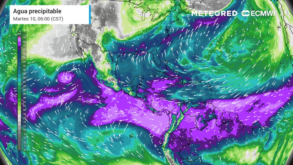 De forma dispersa abarcarían las lluvias de sábado a domingo entre Campeche a Veracruz, Valle de México, Morelos y a lo largo del Eje Neovolcánico, además de Chihuahua y Durango de 10-30 mm, siendo probables mayores a 100 mm en el Istmo de Tehuantepec aumentando potencial de efectos urbanos negativos.