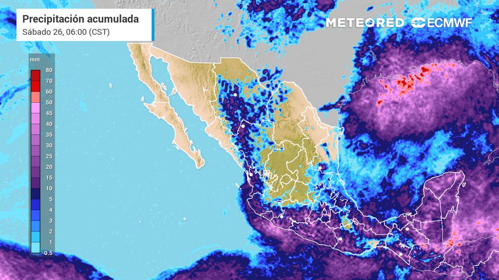 Durante el sábado seguirán aumentando las precipitaciones entre Veracruz, Tabasco, Chiapas, Oaxaca, Jalisco, Colima, Michoacán y la Sierra Madre Occidental con locales de 70-100 mm, continuando de 20-50 mm en promedio sobre el occidente, centro y sur, rondando 10-30 mm en el noreste y mucho menores en península de Yucatán.