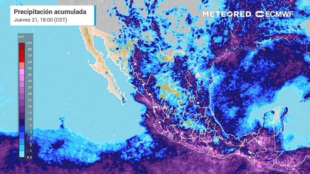 El domingo sería un panorama similar, aunque ligeramente en menor cantidad, persistiendo las más abundantes en el Altiplano, occidente y noreste superándose los 100 mm de forma puntual. El Valle de México, Pacífico sur y Golfo de México rondarían los 10-30 mm con locales de 50-75 mm, mientras el noroeste, noreste y península de Yucatán podrían tener lluvias mínimas o nulas.