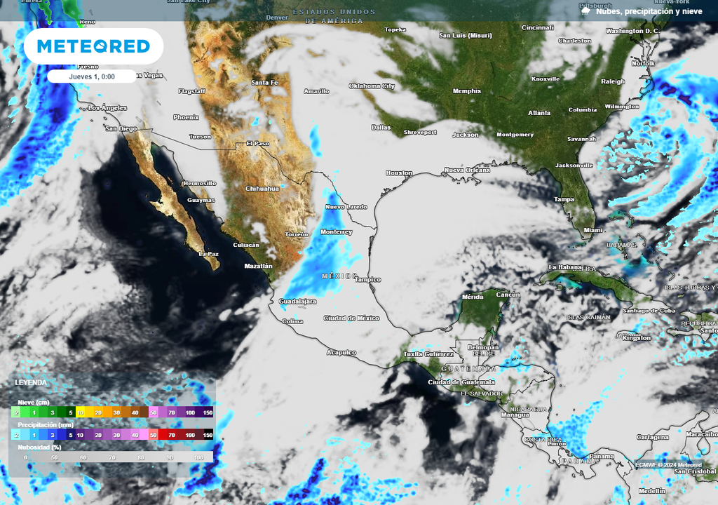 Desde el jueves por la noche y durante el viernes, las lluvias serían fuertes en Baja California, Baja California Sur, Sonora, Chihuahua, Sinaloa y Coahuila de 20-50 mm y extremas de 70-150 mm, resaltando montañas del noroeste, además de fuertes nevadas entre Sonora y Chihuahua con espesores de 10 a 35 cm.
