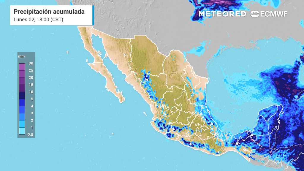 La entrada de humedad proveniente de los litorales del Pacífico, Golfo de México y Mar Caribe dejará lluvias a su paso. Se pronostican lluvias moderadas (5 a 25 mm) en Durango, Jalisco, Michoacán, Oaxaca, Chiapas y Quintana Roo; además de lluvias ligeras (menos de 5 mm) en el Occidente, Centro y Sureste, incluyendo al Estado de México, Veracruz y Yucatán.
