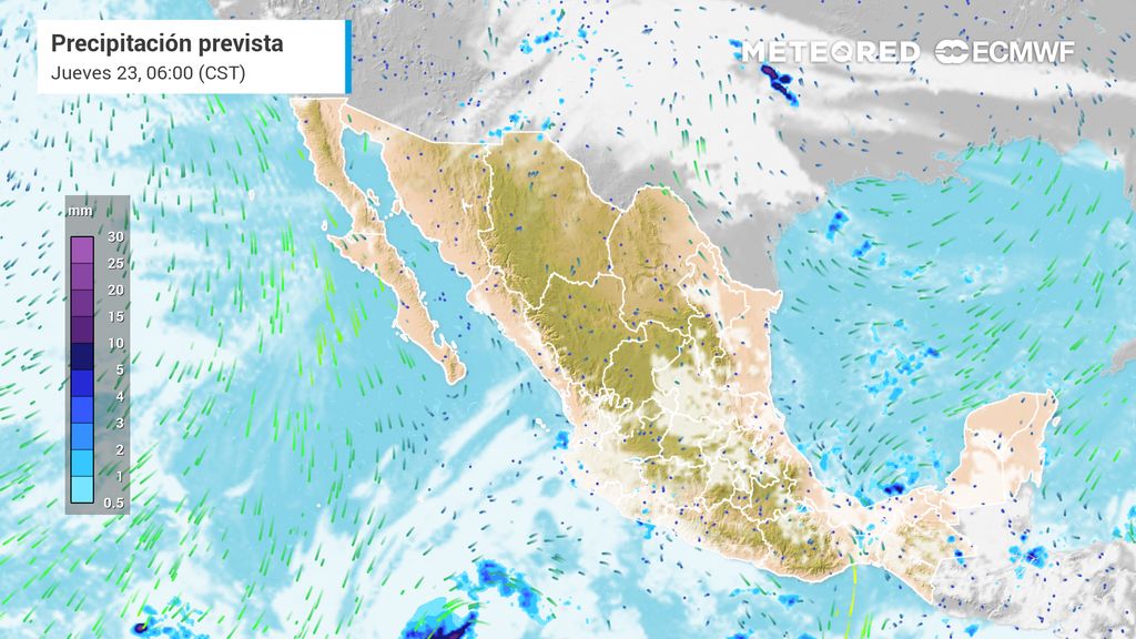 También se esperan lluvias moderadas (5 a 25 mm) en Puebla, Veracruz, Nayarit, Jalisco, Colima, Michoacán y Estado de México.
