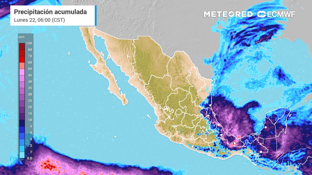 Por lo anterior, los pronósticos indican que se presentarán lluvias muy fuertes (50 a 75 mm) en Veracruz, Oaxaca y Chiapas, lluvias fuertes (25 a 50 mm) en Tabasco, Campeche y Quintana Roo, lluvias moderadas (5 a 25 mm) en Veracruz, Chiapas y Yucatán.