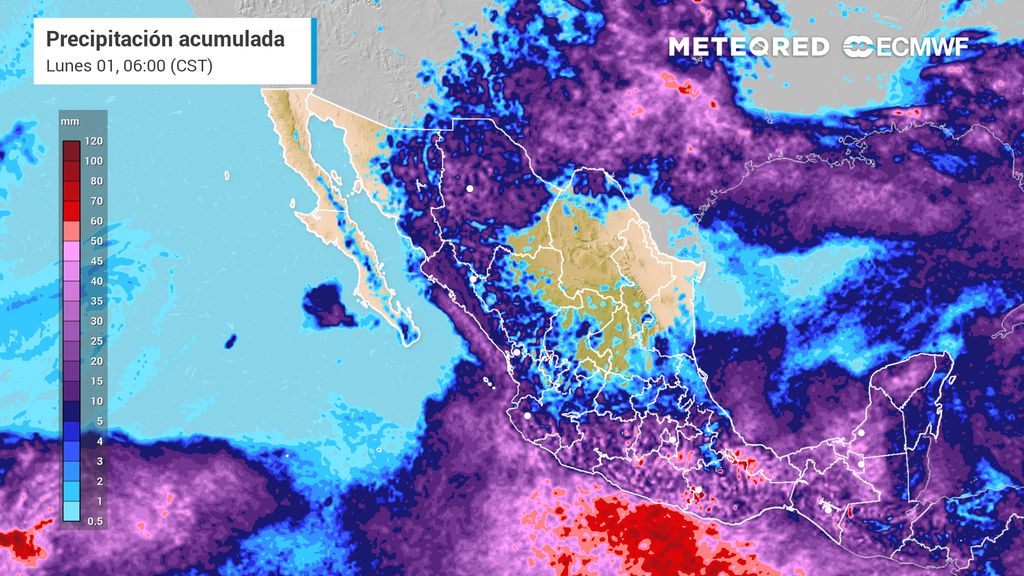Al respecto, se pronostican lluvias intensas (75 a 100 mm) en Guerrero, Oaxaca, Veracruz y Chiapas, lluvias muy fuertes (50 a 75 mm) en Sonora, Chihuahua, Michoacán, Puebla y Tabasco, lluvias fuertes (25 a 50 mm) en Sinaloa, Durango, Nayarit, Jalisco, Colima, Guanajuato, Querétaro, Hidalgo, Estado de México, Ciudad de México, Morelos, Tlaxcala, Campeche, Yucatán y Quintana Roo.