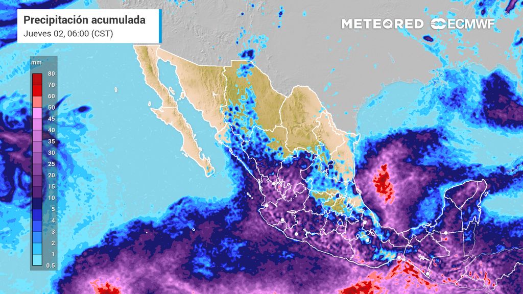 Se esperan lluvias intensas (75 a 100 mm) en Guerrero, Oaxaca, Chiapas, Tabasco y Veracruz, lluvias muy fuertes (50 a 75 mm) en Michoacán, Estado de México, Morelos, Puebla, Campeche, Yucatán y Quintana Roo.