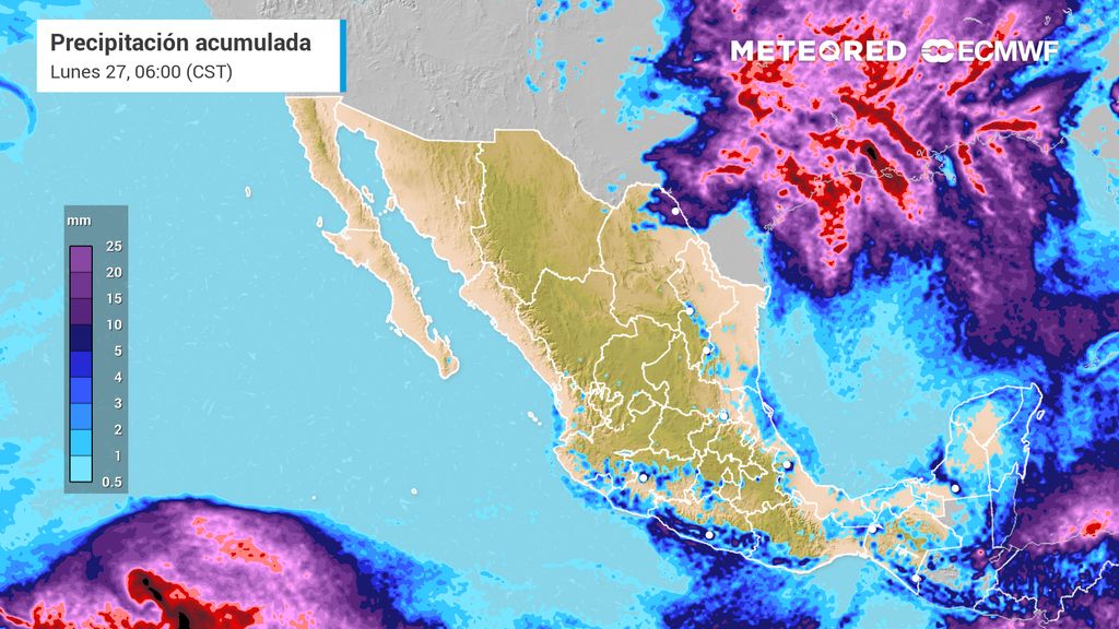 También se pronostican lluvias ligeras (menores a 5 mm) en San Luis Potosí, Puebla, Hidalgo, Veracruz, Coahuila, Tamaulipas, Nayarit, Guanajuato, Ciudad de México, Tlaxcala y Morelos.