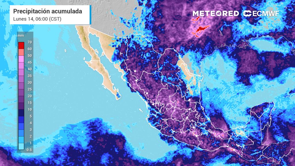 En este sentido, se pronostican lluvias muy fuertes (50 a 75 mm) en Sonora, Chihuahua, Durango, Sinaloa, Zacatecas (sur), Guanajuato, Jalisco y Puebla, lluvias fuertes (25 a 50 mm) en Coahuila, Nuevo León, Tamaulipas, Nayarit, Jalisco, Colima Michoacán, Guerrero, Aguascalientes, San Luis Potosí, Querétaro, Hidalgo, Tlaxcala, Estado de México, Ciudad de México, Morelos, Veracruz, Oaxaca y Chiapas.