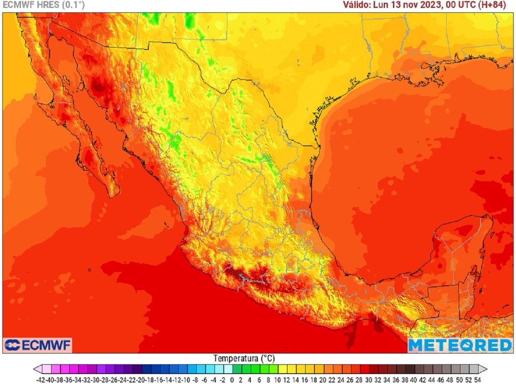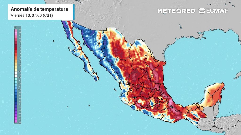 Por su parte, la porción norte, debido al incremento de nubes con lluvias, se extenderían las zonas con bajas temperaturas, persistiendo valores desde 5 °C en montañas hasta 10-20 °C en zonas bajas y de ciudades. Los estados del Pacífico mantendrán calor en este periodo con 28-36°C
