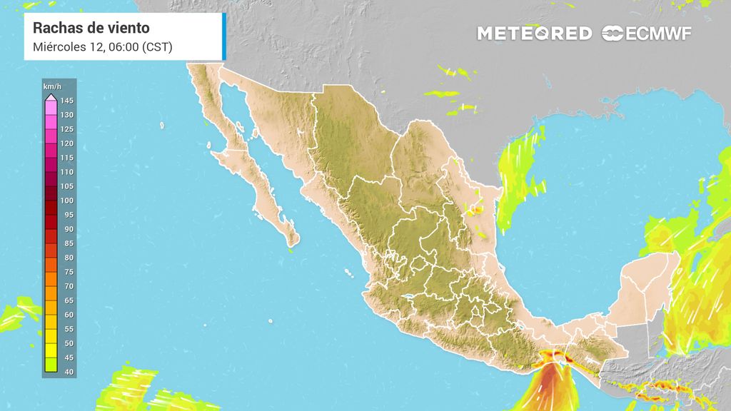 A su paso estará generando lluvias de moderada a fuertes sobre la mayor parte de la región; pero lo más importante serán las condiciones de viento que traerá consigo, ya que en zonas costeras su velocidad podrían alcanzar entre los 60 y 80 km/h, mientras que en el interior de la península no se descartan rachas de alrededor de 60 km/h.