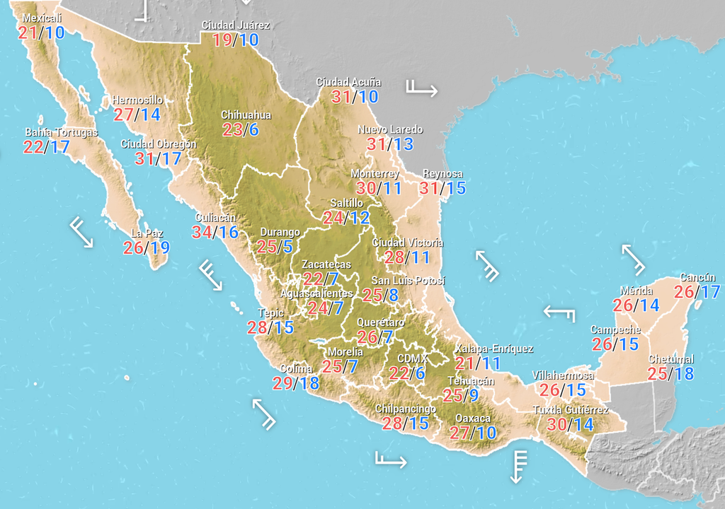 Las temperaturas mínimas se prevén de -10 a -5 °C con heladas en Chihuahua y Durango, y temperaturas mínimas de -5 a 0 °C con heladas Baja California, Sonora, Nuevo León, San Luis Potosí, Zacatecas, Guanajuato, Michoacán, Estado de México, Hidalgo, Tlaxcala, Puebla, Veracruz y Oaxaca.