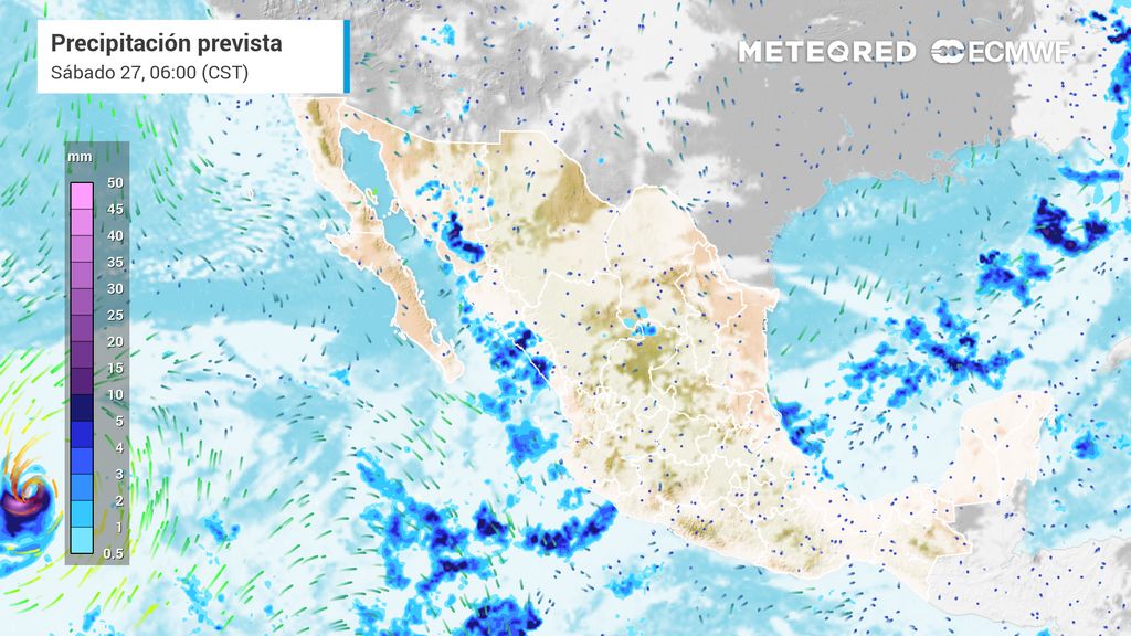 En este sentido, se pronostican lluvias intensas (75 a 100 mm) en Sinaloa, Nayarit y Chihuahua y lluvias muy fuertes (50 a 75 mm) en Sonora, Durango, Coahuila, Nuevo León, Tamaulipas, San Luis Potosí, Puebla, Veracruz, Jalisco, Colima, Michoacán, Morelos, Guerrero y Oaxaca.