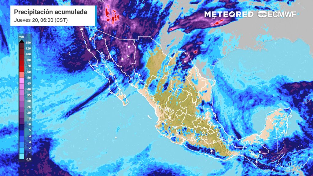 Se esperan lluvias fuertes (25 a 50 mm) en Baja California, Sonora, Guerrero, Oaxaca y Chiapas, y lluvias moderadas (5 a 25 mm) en Baja California Sur, Chihuahua, Michoacán, Estado de México, Morelos, Veracruz (región Olmeca), Tabasco, Campeche, Yucatán y Quintana Roo.