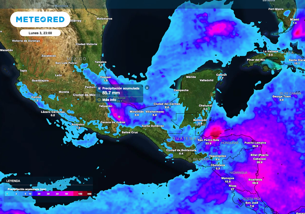 Las lluvias mar relevantes serán al Sur de México entre el sur de Veracruz y el norte de Chiapas y Oaxaca los valores de lluvia acumulada pudieran registrar de 70 a 90 mm, mientras que el resto de esas entidades valores de 40 a 60 mm. Para la Península de Yucatán también habrán valores de 10 a 20 mm.