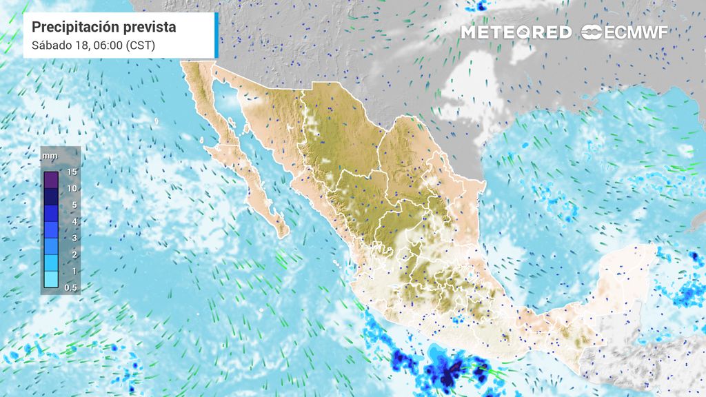 En este sentido, los pronósticos indican que se presentarán lluvias intensas (75 a 100 mm) en Chiapas y Oaxaca, lluvias muy fuertes (50 a 75 mm) en Nayarit, Jalisco, Guerrero, Yucatán y Quintana Roo, lluvias fuertes (25 a 50 mm) en Coahuila, Durango, Sinaloa, Colima, Michoacán, Veracruz, Tabasco y Campeche.